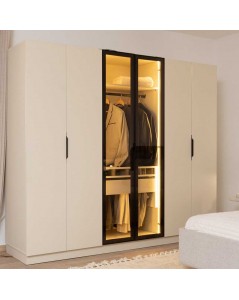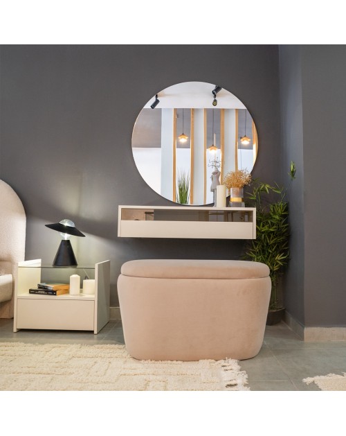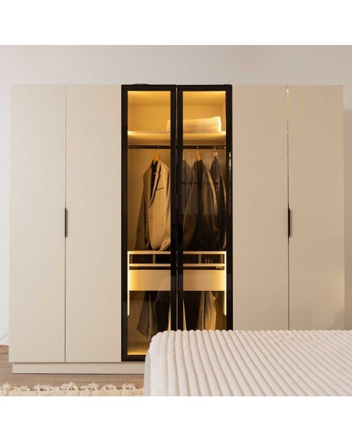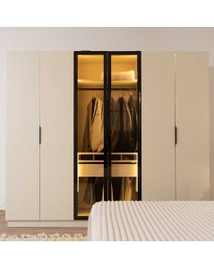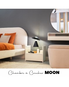 Ensemble composé d’un lit double (160x190 cm), de deux tables de chevet, d’un dressing spacieux à portes coulissantes semi vitrées et d’une coiffeuse suspendue de la même gamme.